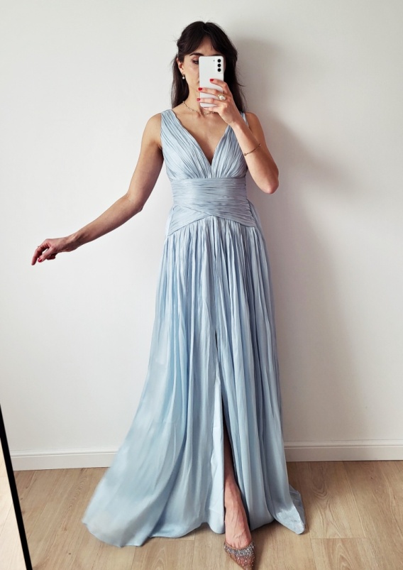 Ariell błękitna długa sukienka delikatnie marszczona w talii