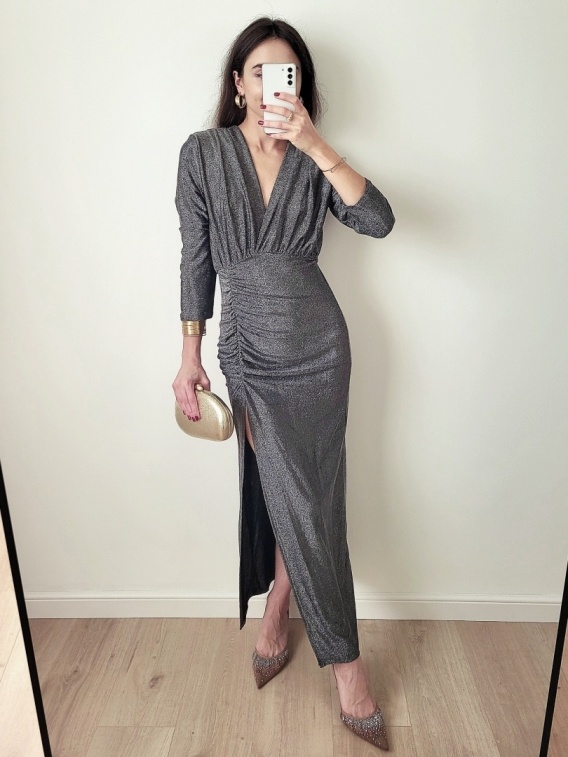 Długa srebrna sukienka brokatowa z rozcięciem. Długie rękawy. Delikatnie marszczona w talii.