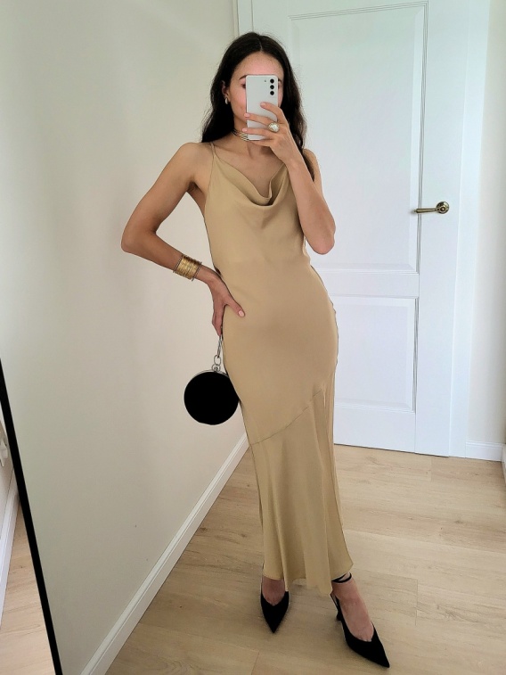 Beżowa satynowa sukienka wiązana na plecach