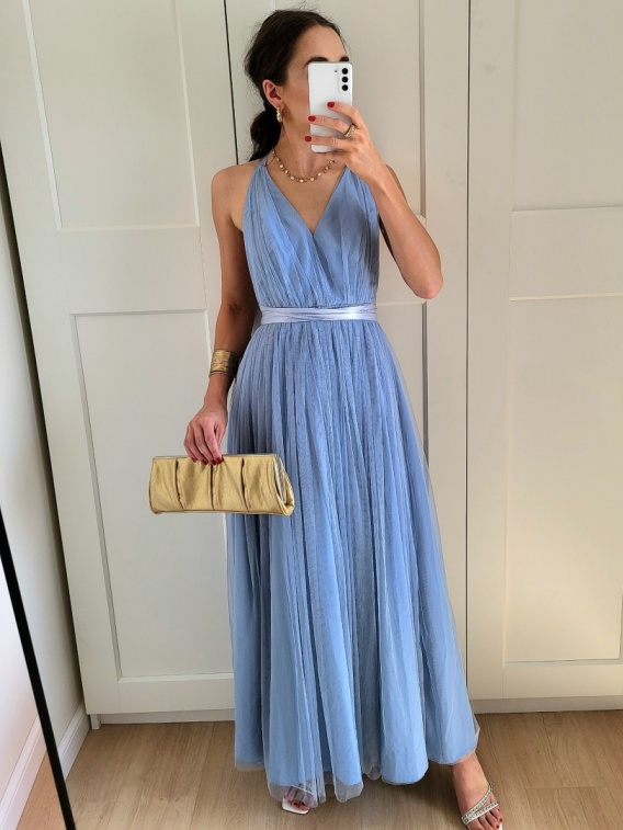 Błękitna tiulowa sukienka maxi z odkrytymi plecami