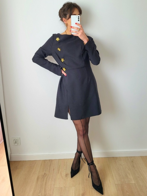 Czarna prosta krótka sukienka z kwiatową aplikacją XL