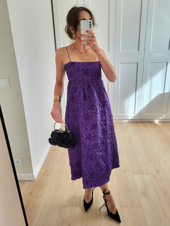 Fioletowa sukienka rozkloszowana z tłoczonego materiału
