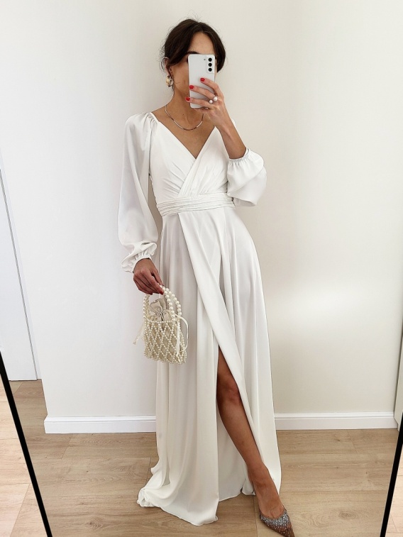 Satynowa suknia ślubna z długim rękawem Katniss o prostym kroju z rozcięciem.