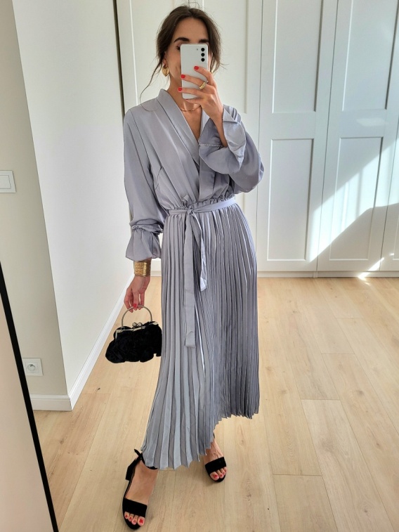 Szara satynowa sukienka z plisowanym dołem